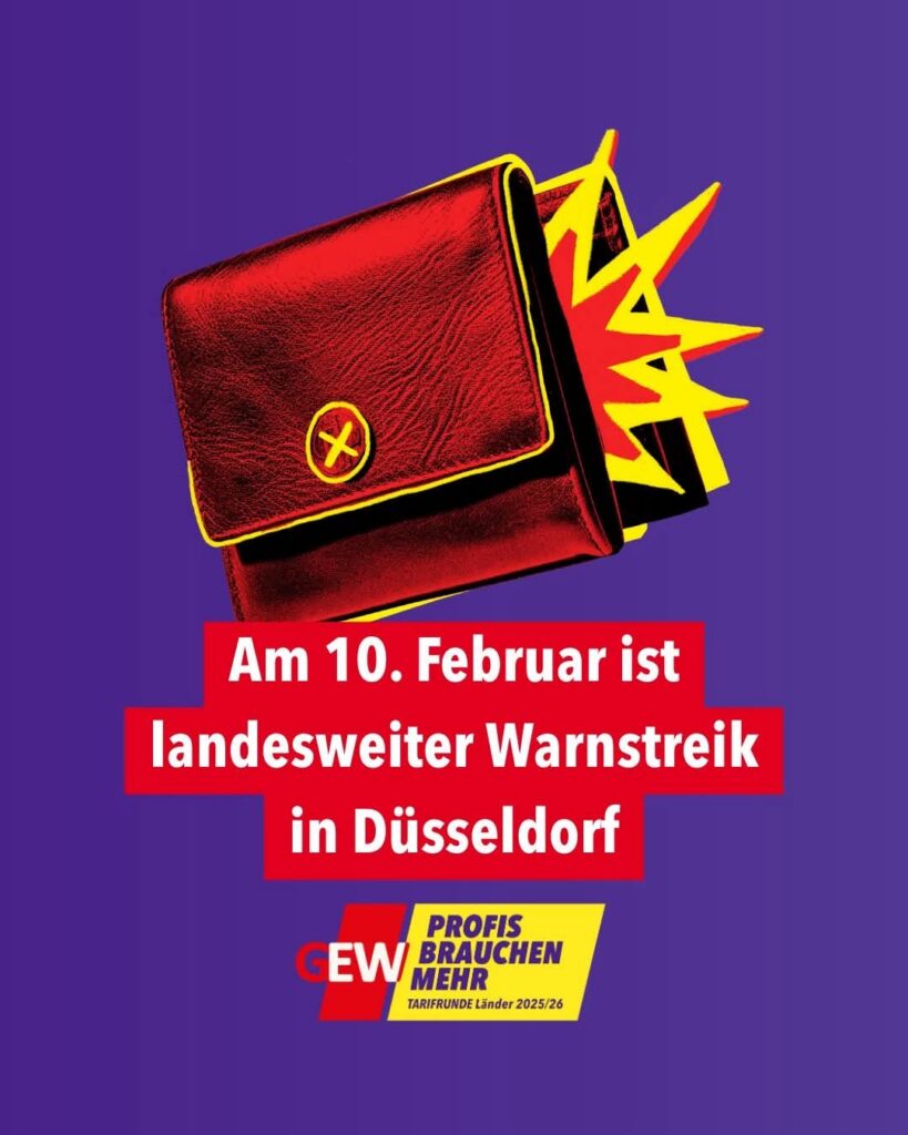 um unseren Forderungen Nachdruck zu verleihen, ruft die GEW NRW und die GEW Viersen ihre Mitglieder im Geltungsbereich des TV-L am 10.02.2026 in Düsseldorf zu einem ganztätigen Warnstreik auf.